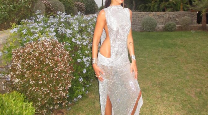 Dua Lipa poses braless in a see-through silver dress, flauntin’ her slender figure and some sideboob.